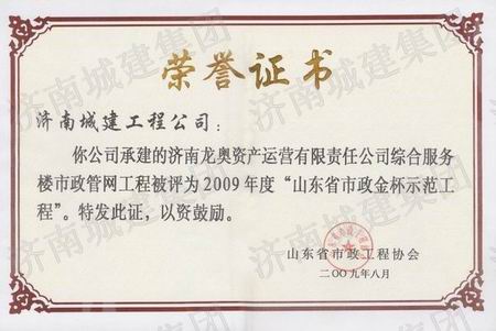 济南龙奥资产运营有限责任公司综合服务楼市政管网工程被评为2009年度山东省市政金杯示范工程