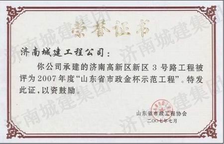 济南高新区新区3号路工程被评为2007年度山东省市政金杯示范工程