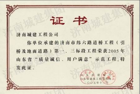 济南市纬六路道桥工程荣获2005年度山东省“质量诚信、用户满意”示范工程