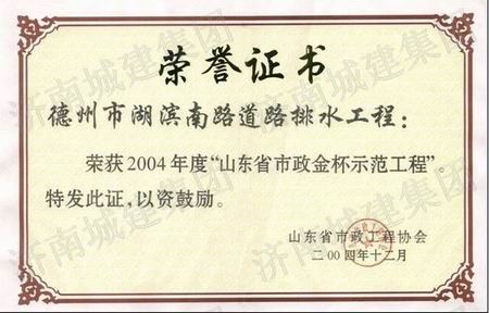 德州市湖滨南路道路排水工程荣获2004年度山东省市政金杯示范工程