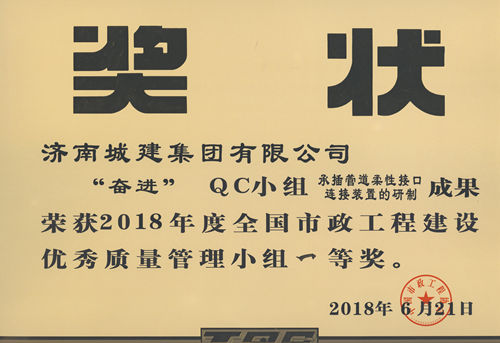 集团“奋进”QC小组《承插管道柔性接口连接装置的研制》成果荣获2018年度全国市政工程建设优秀质量管理小组一等奖