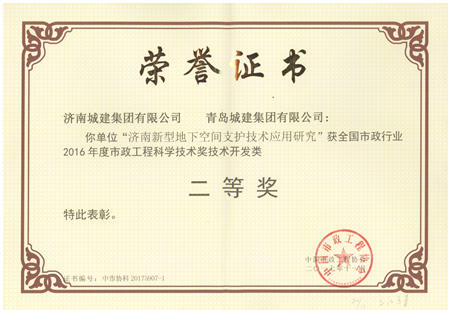 济南新型地下空间支护技术应用研究获全国市政行业2016年度市政工程科学技术奖技术开发类二等奖
