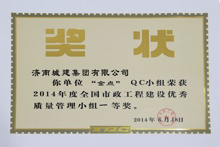 “金点”QC小组荣获2014年度全国市政工程建设优秀质量管理小组一等奖