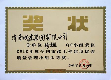 “跨越”QC小组荣获2012年度全国市政工程建设优秀质量管理小组三等奖
