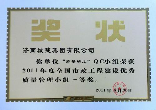 “质量研发”QC小组荣获2011年度全国市政工程建设优秀质量管理小组一等奖