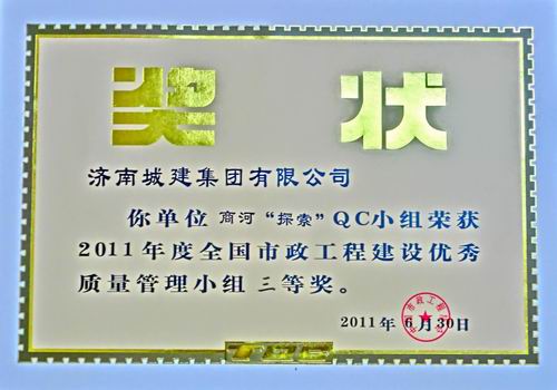 商河“探索”QC小组荣获2011年度全国市政工程建设优秀质量管理小组三等奖