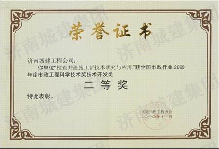 检查井盖施工新技术研究与应用获全国市政行业2009年度市政工程科学技术奖技术开发类二等奖