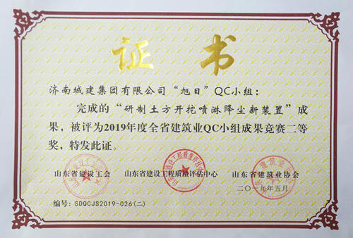 集团”旭日“QC小组完成的《研制土方开挖喷漆降尘新装置》成果被评为“2019年度全省建筑业QC小组成果竞赛二等奖