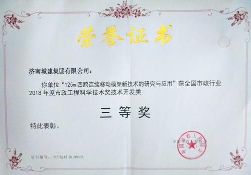 集团《125m四跨连续移动模架新技术的研究与应用》荣获“2018年度市政工程科学技术奖技术开发类三等奖”